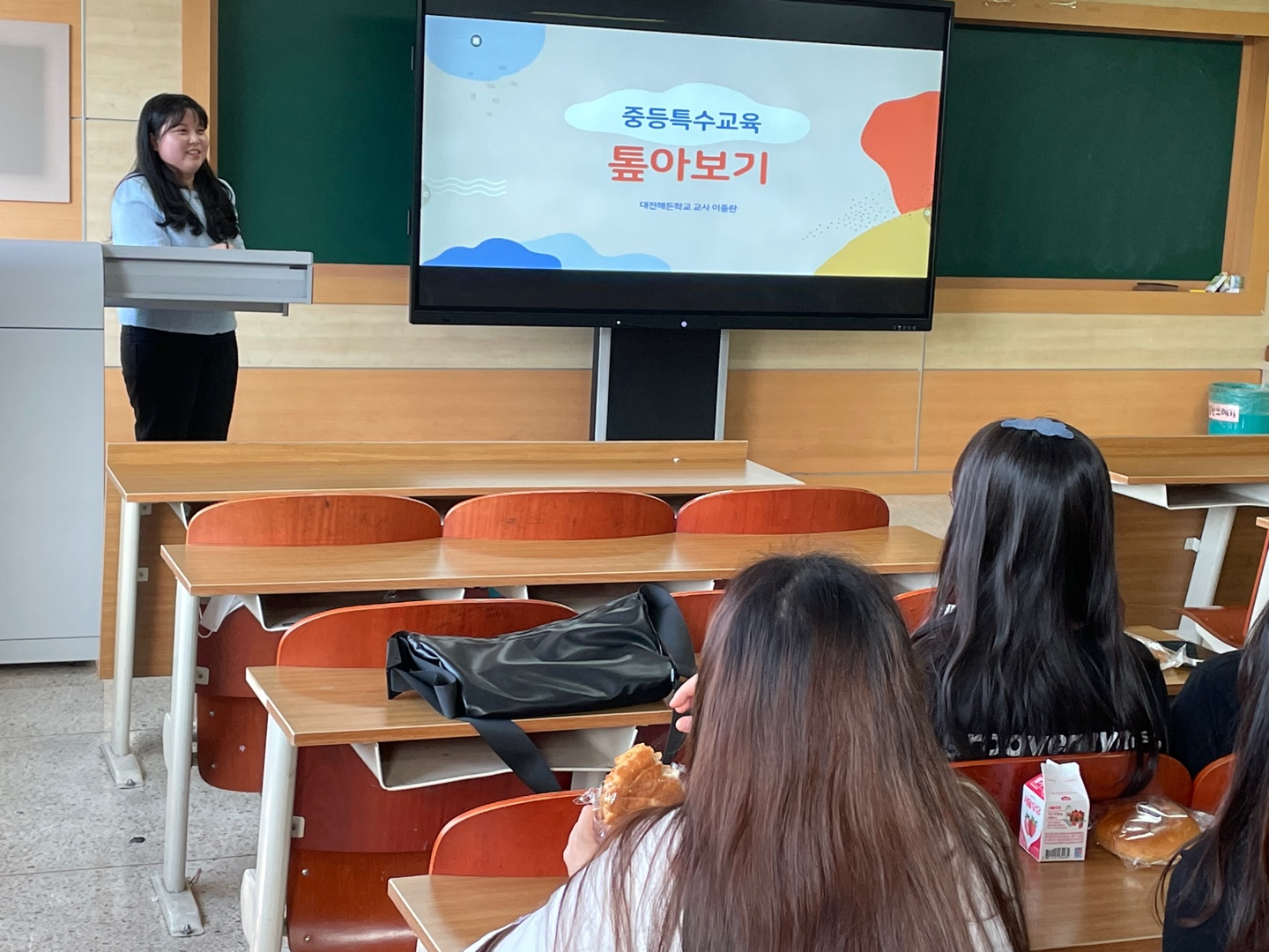 대전해든학교 특수교사인 이*란 선생님이 학교를 방문하여 특수교육이 이루어지는 다양한 학교현장의 모습과 특징을 소개해주셨습니다. 선생님은 특수학교, 특수학급, 특수교육원센터, 병원학교까지 모두 근무한 경험이 있는 자랑스런 키세인입니다. 일시 : 23/5/31 5:30-7:20 장소: 인302 참석 : 1~4학년