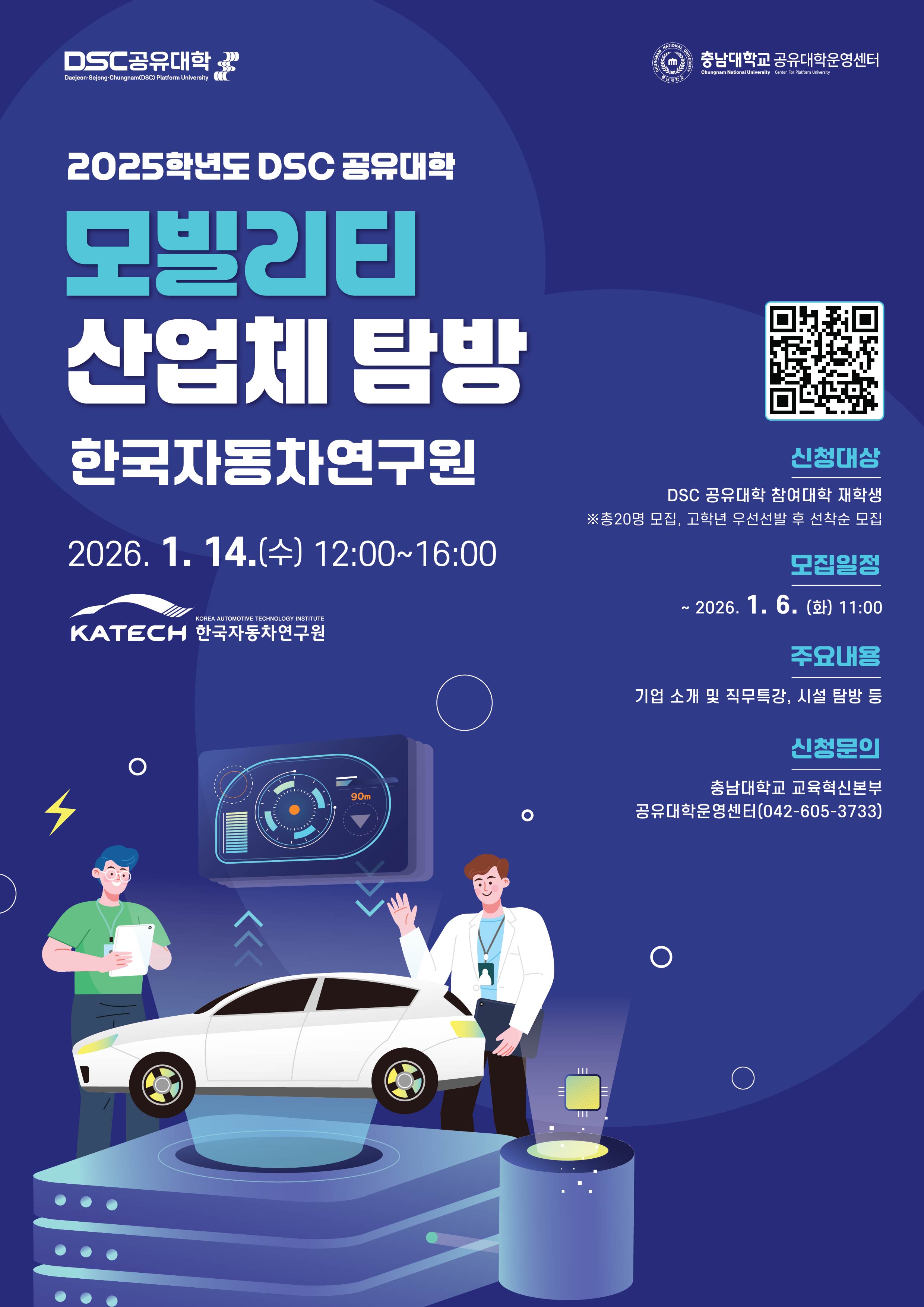 | 제목 | 2025년 DSC 공유대학 모빌리티 산업체 탐방(한국자동차연구원) 프로그램 안내 | ||||