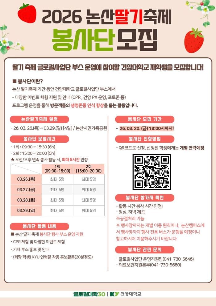 『 2026 논산딸기축제 봉사단 모집안내 (2026.03.26.~03.29.) 』글의 상세내용을 확인하는 표로 제목, 부서명, 등록일, 조회, 첨부, 내용으로 나뉘어 설명합니다.
