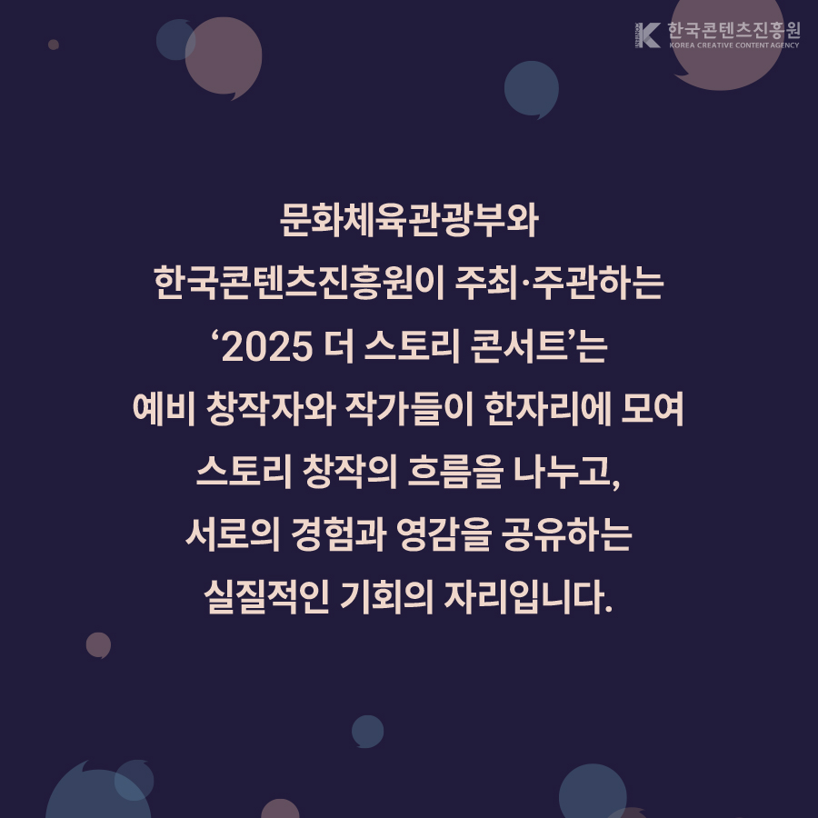 문화체육관광부와 한국콘텐츠 진흥원이 주최·주관하는 <2025 더 스토리 콘서트>에 초대합니다! ? 창작의 첫 걸음을 떼려는 예비창작자 ? 현직 작가들의 생생한 경험과 노하우를 배우고 싶은 분 ? 창작물을 사업화 하는 과정에 대한 궁금증이 있는 분 예비·신진 창작자분들이 궁금했던 모든 것들을 작가님들의 경험담을 통해 해소시켜드립니다. 참가 신청 페이지? https://forms.gle/KHdEA83T3qdTTbvR6