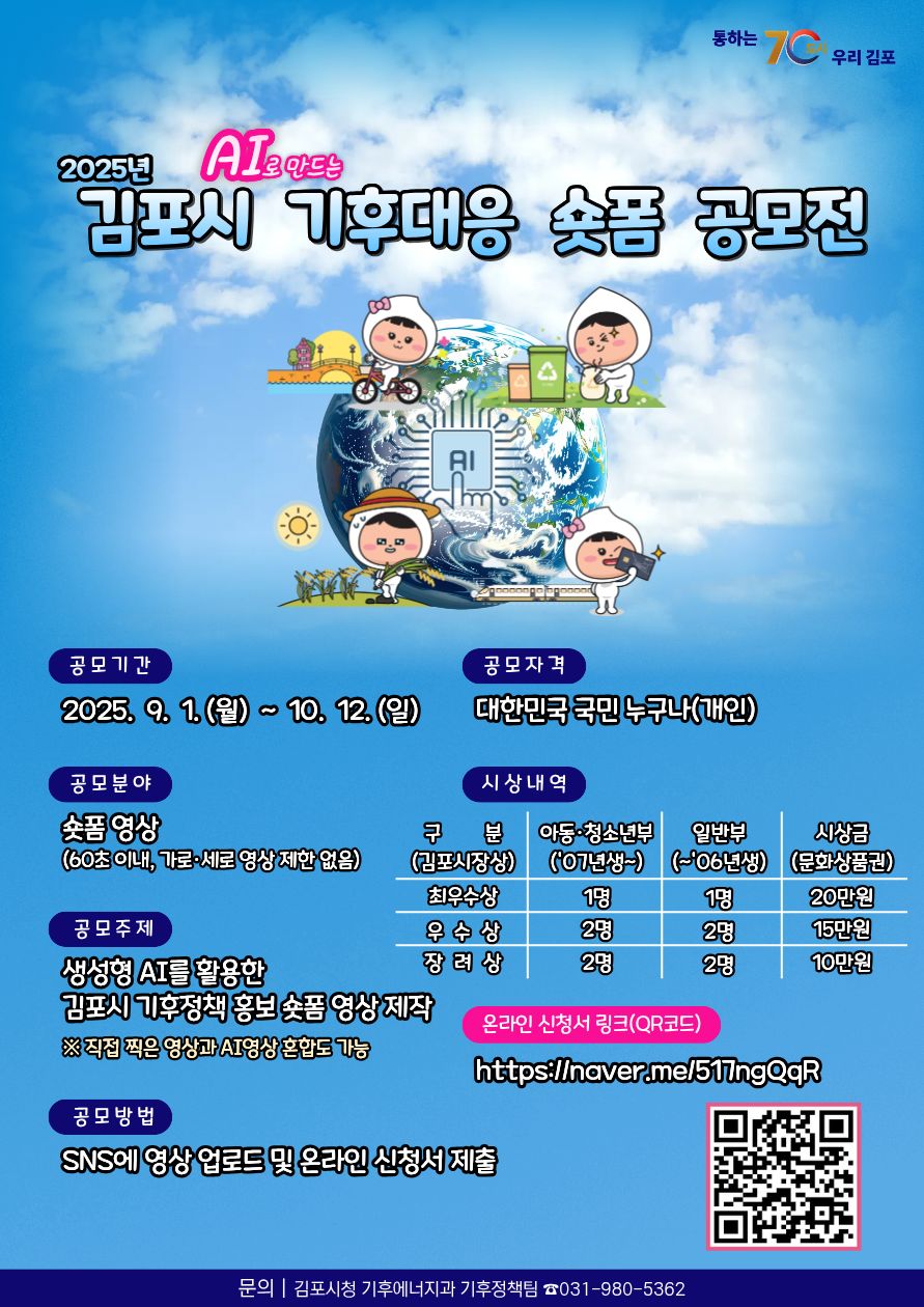 2025년 김포시 AI로 만드는 기후대응 숏폼 공모전 ○ 공모기간 : 2025. 9. 1.(월) ~ 10. 12.(일) 24:00까지 ○ 공모자격 : 대한민국 국민 누구나(개인) ○ 공모분야 : 숏폼 영상(60초 이내, 가로·세로 영상 제한 없음 ○ 공모주제 : 생성형 AI를 이용하여 김포시 기후정책 홍보에 활용할 수 있는 숏폼 영상 제작 ○ 공모방법 : SNS에 영상 업로드 및 온라인 신청서 제출